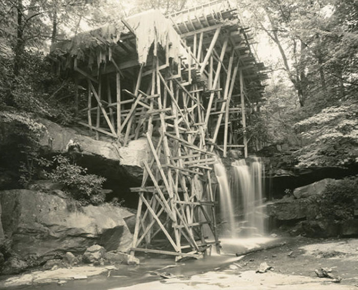 Scaffold and formwork in place for the concrete pours of the cantilevers. 1936. Fallingwater Archives, Western Pennsylvania Conservancy, 2014.1.10.