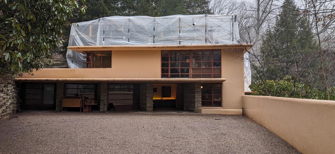 The heated enclosure over the Staff Quarters and Carport allows the repointing team to work during cold weather.