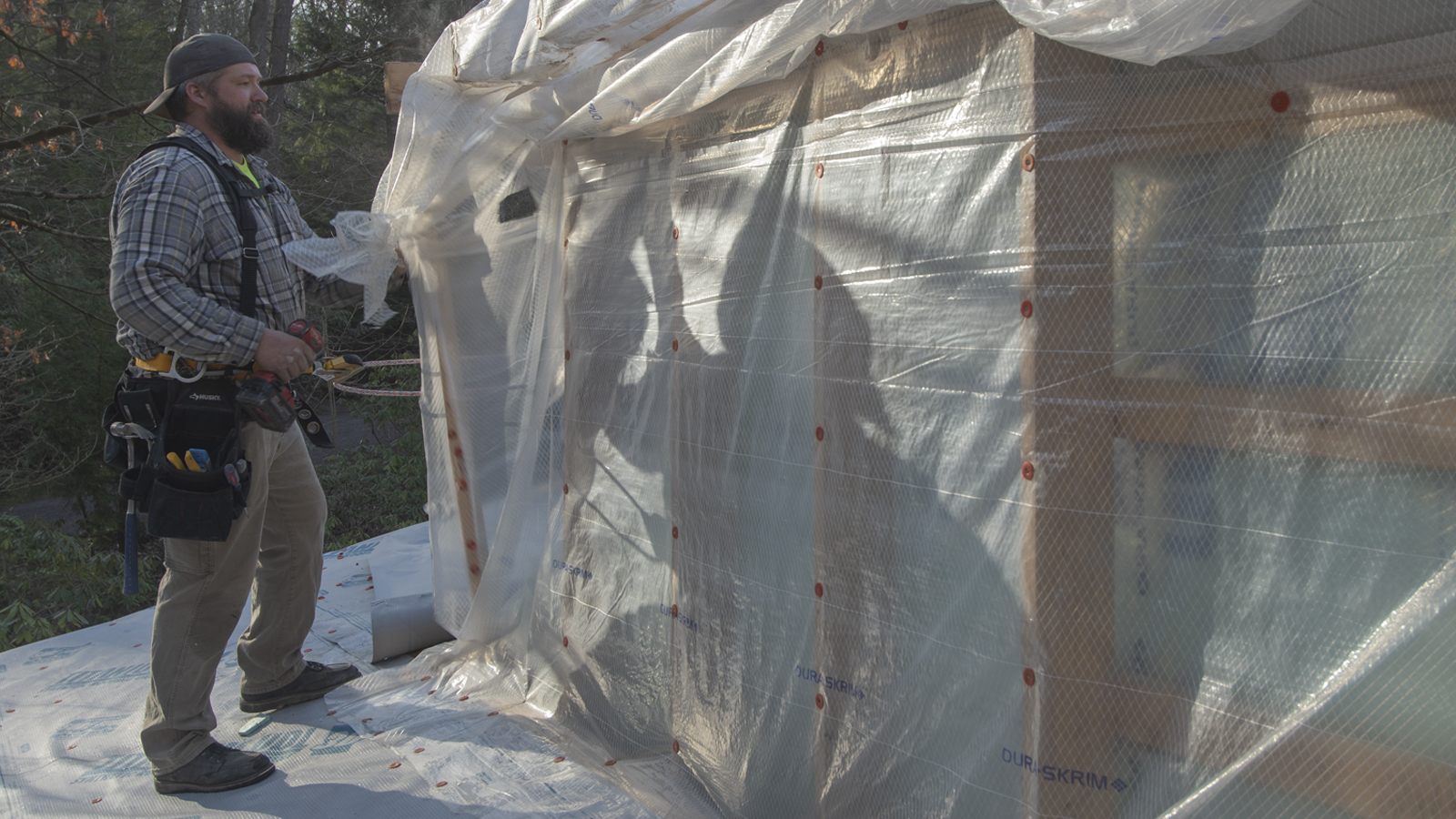 Maintenance Specialist Ben Morrison carefully “unwraps” Fallingwater’s plastic enclosures from above the East Terrace and trellis.