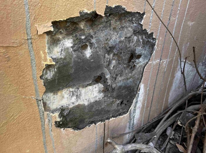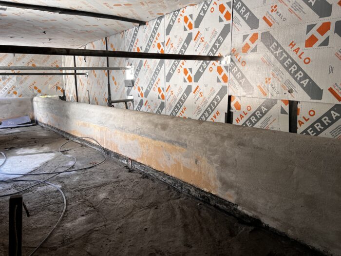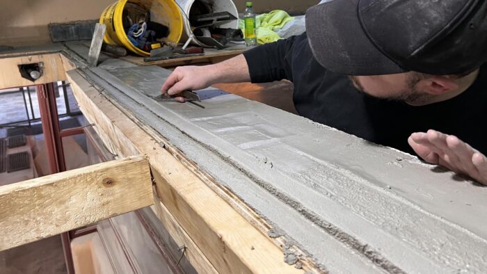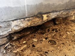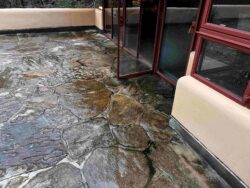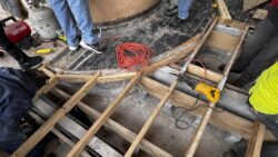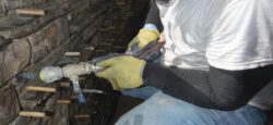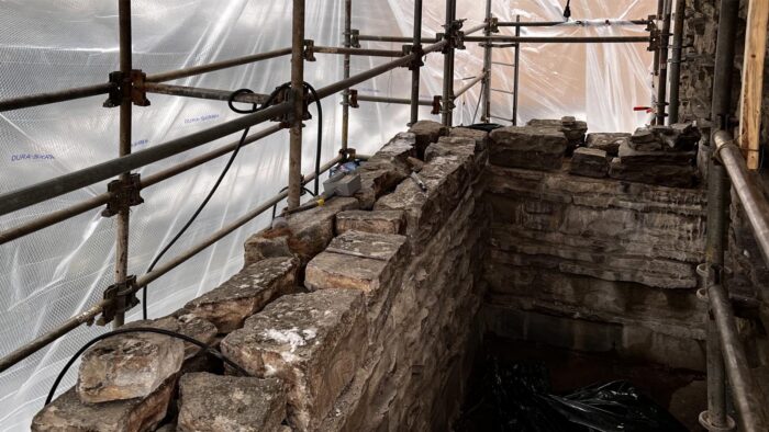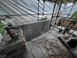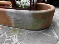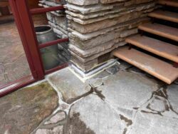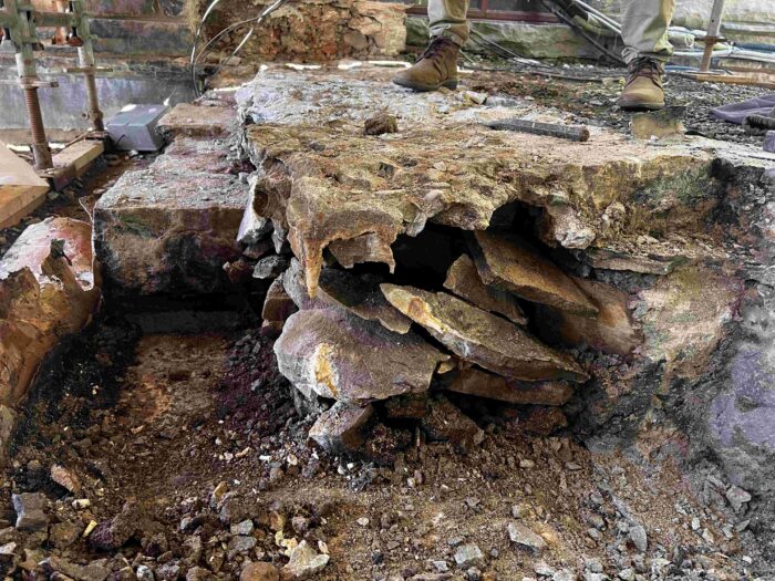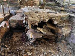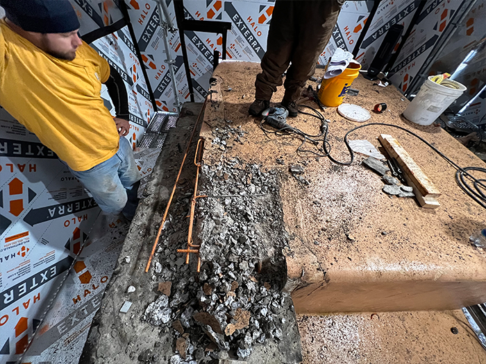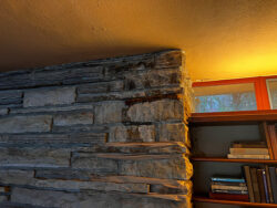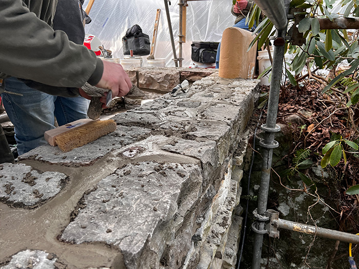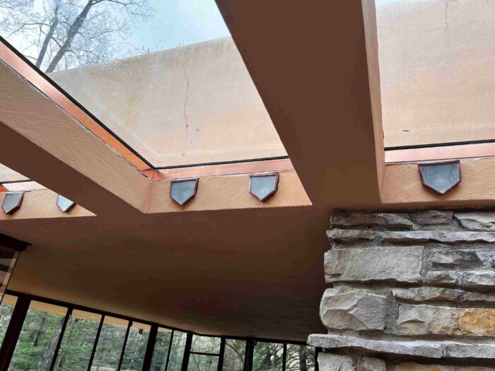 Although the majority of the Canopied Walkway is in good condition, the stone pier that supports the lower part of the canopy required significant repairs. Constructed of reinforced concrete, this element of Wright’s design is only four inches thick, and cracks have caused the steel reinforcing bars to become exposed to the elements. This exposure has allowed water to wick into the concrete, leading to the expansion and corrosion of the steel, which, when untreated, could potentially cause structural damage.