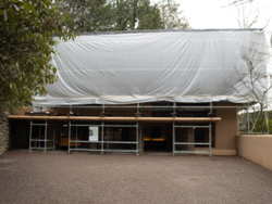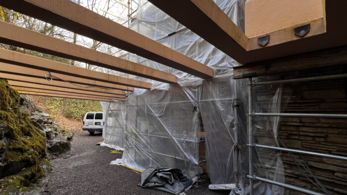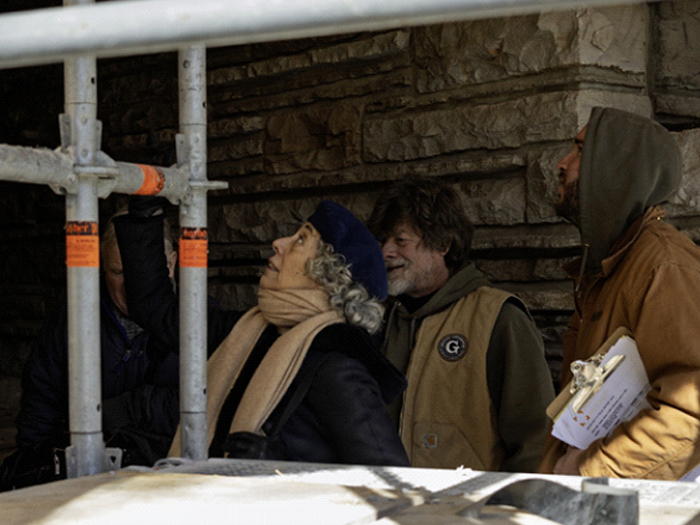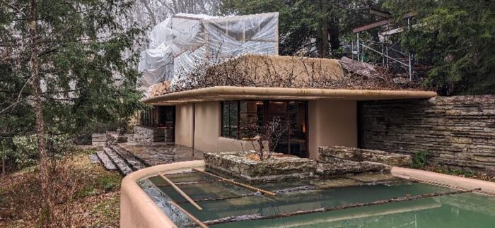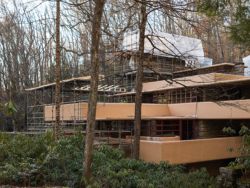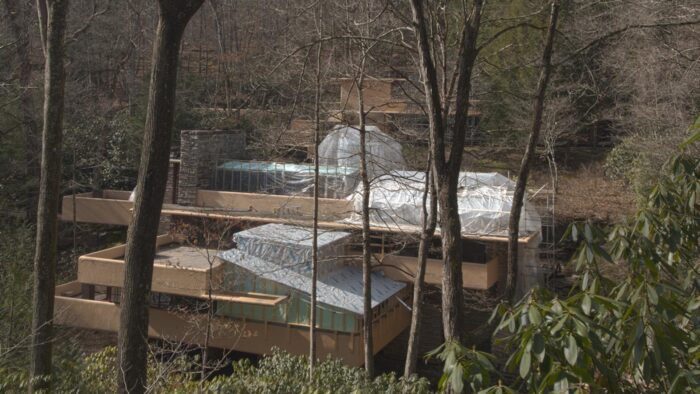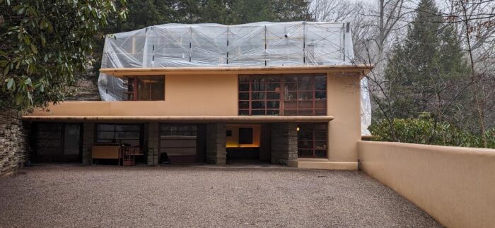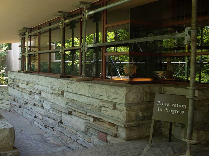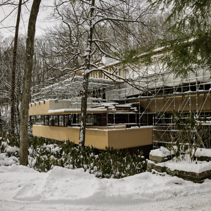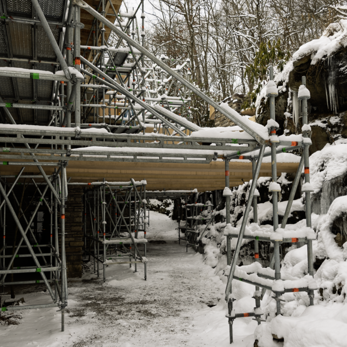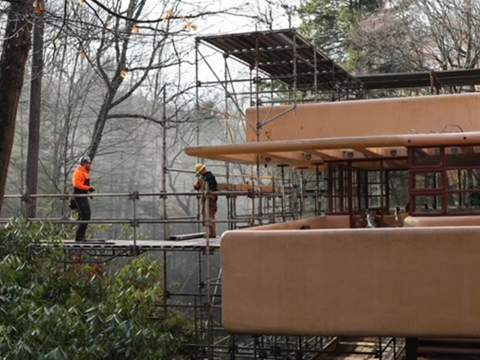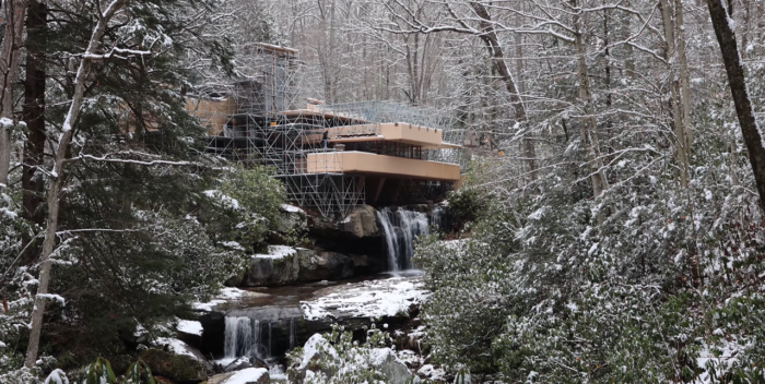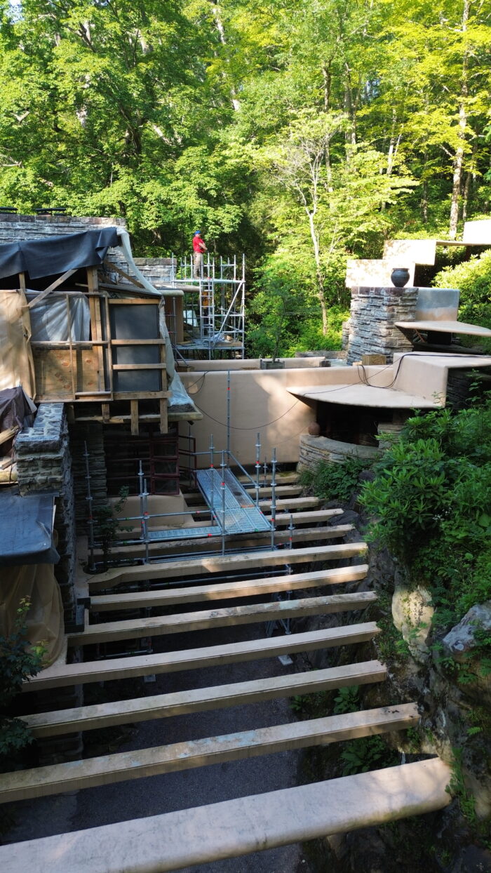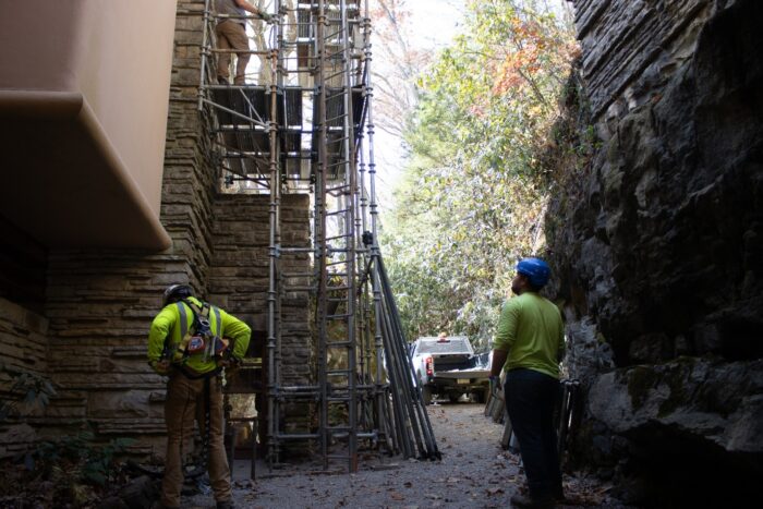 As you may have noticed on the Fallingwater Live Cam, scaffolding now envelopes much of Fallingwater’s south and west facades. This preservation work is expected to be completed by the end of March. We plan to have the scaffolding removed as soon as we can, but the scale of the preservation work demands meticulous attention to detail and some flexibility in the scheduling. Stay tuned to our social media platforms and this blog for updates. And, don’t forget to schedule a Preservation-in-Action Tour to see this work in action!